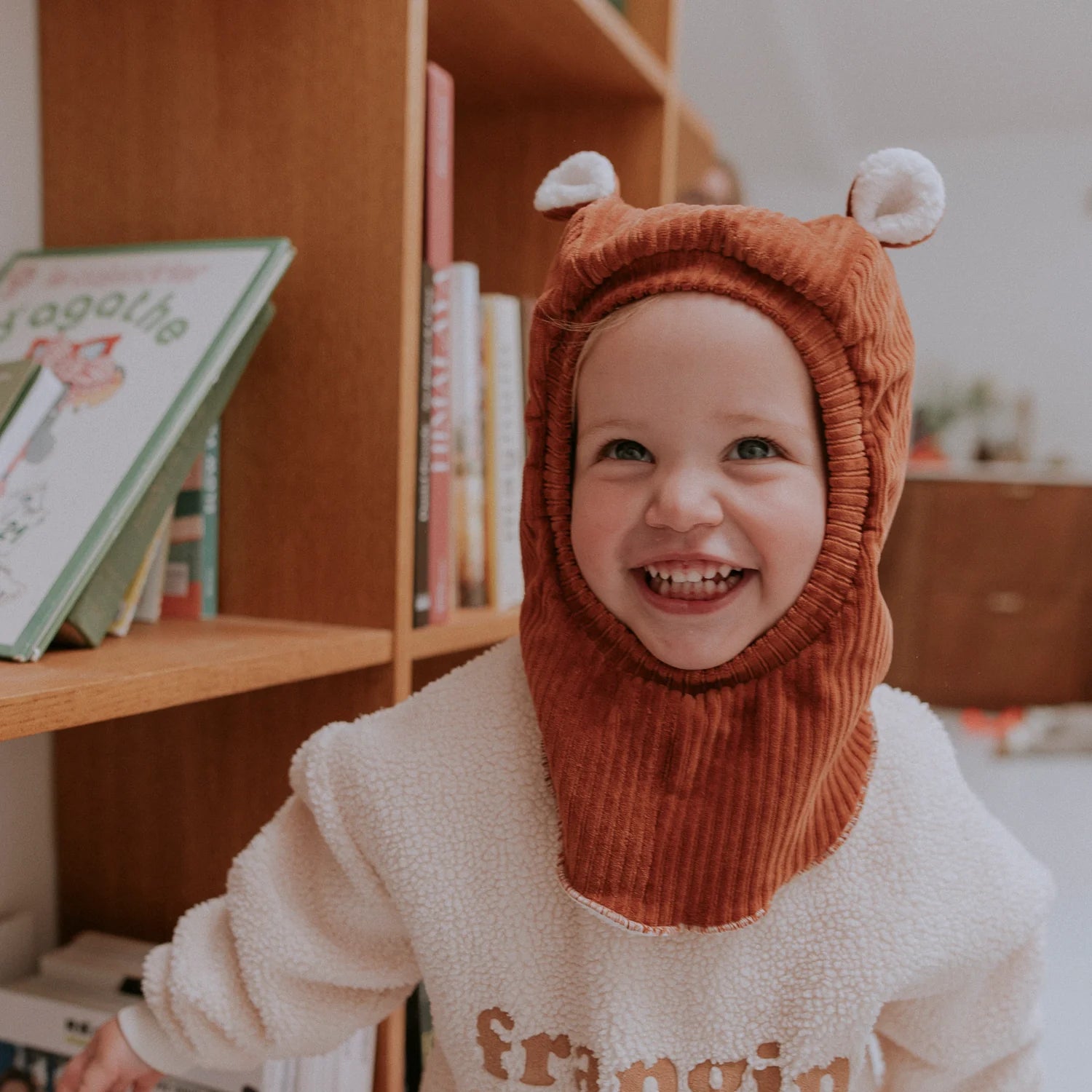 Donnez du style au dressing d’hiver de votre bébé avec cette cagoule en velours côtelé. Doublée en teddy ultra moelleux, elle offre un parfait équilibre entre chaleur, confort et originalité.