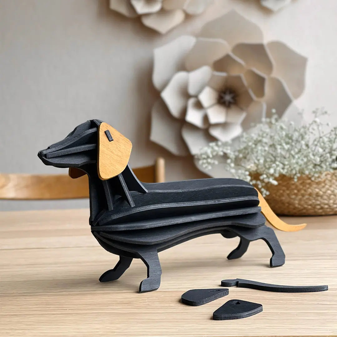 Avec son allure joviale, ce teckel reproduit fidèlement les traits d'un petit chien plein de vie. Son corps oblong, ses pattes courtes et trapues, son museau pointu et sa queue relevée lui confèrent un charme typique du teckel.