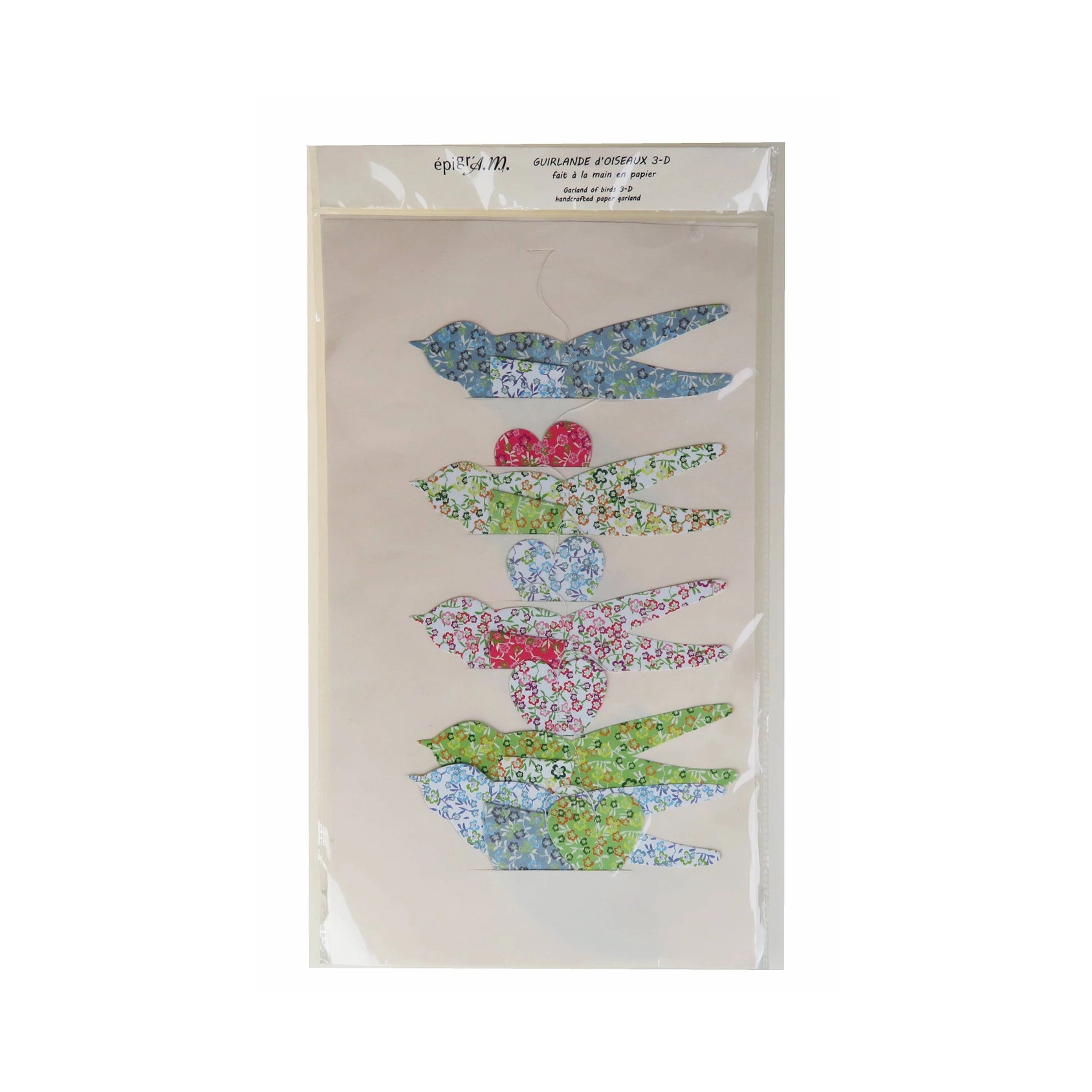 Des oiseaux en 3-D ornent cette guirlande gaie et printanière, très légère, qui frémit au moindre mouvement d'air... pour une chambre d'enfant, un séjour, un décor de fête...