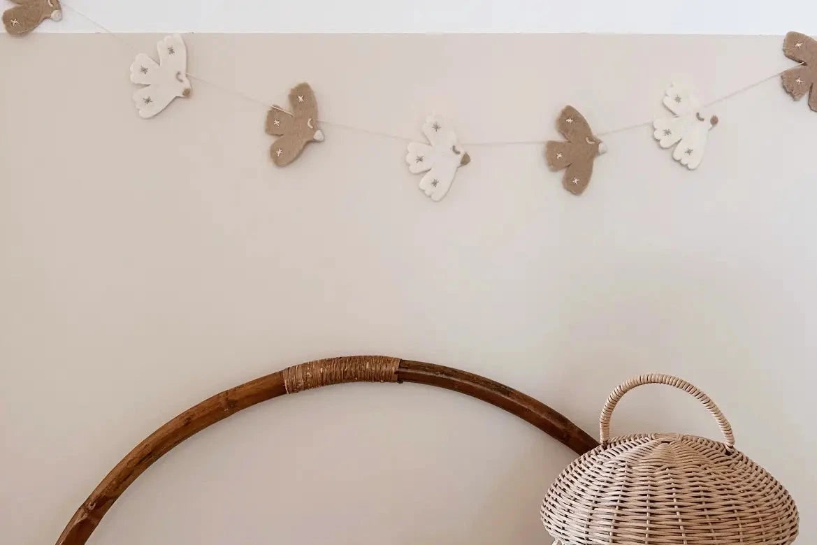 Douceur et tendresse s'invitent avec cette guirlande d'oiseaux en laine feutrée. Son design épuré et minimaliste s'intègre parfaitement dans une déco douce et chaleureuse.