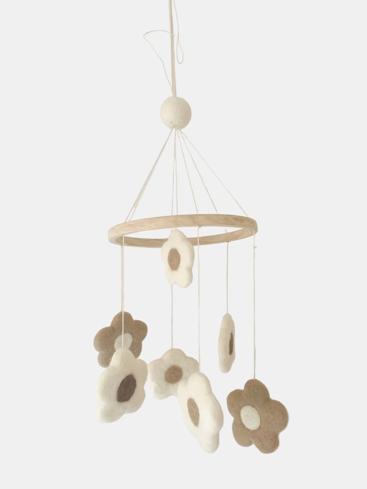 Apportez une touche florale et poétique à la chambre de bébé avec ce mobile décoratif aux fleurs en laine feutrée. Son design épuré et minimaliste s'intègre parfaitement dans une déco douce et chaleureuse.