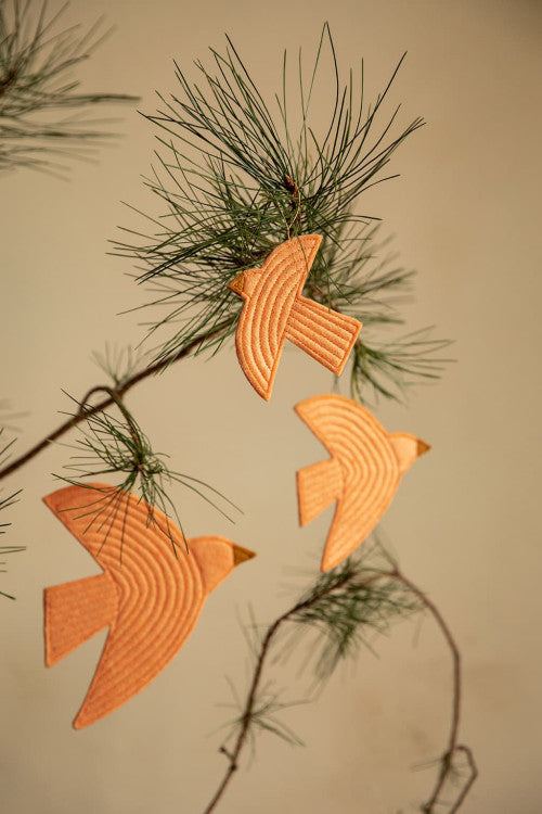 Fabrication artisanale issue du commerce équitable - Set de 3 oiseaux décoratifs en feutre à suspendre, fait à la main au Népal.